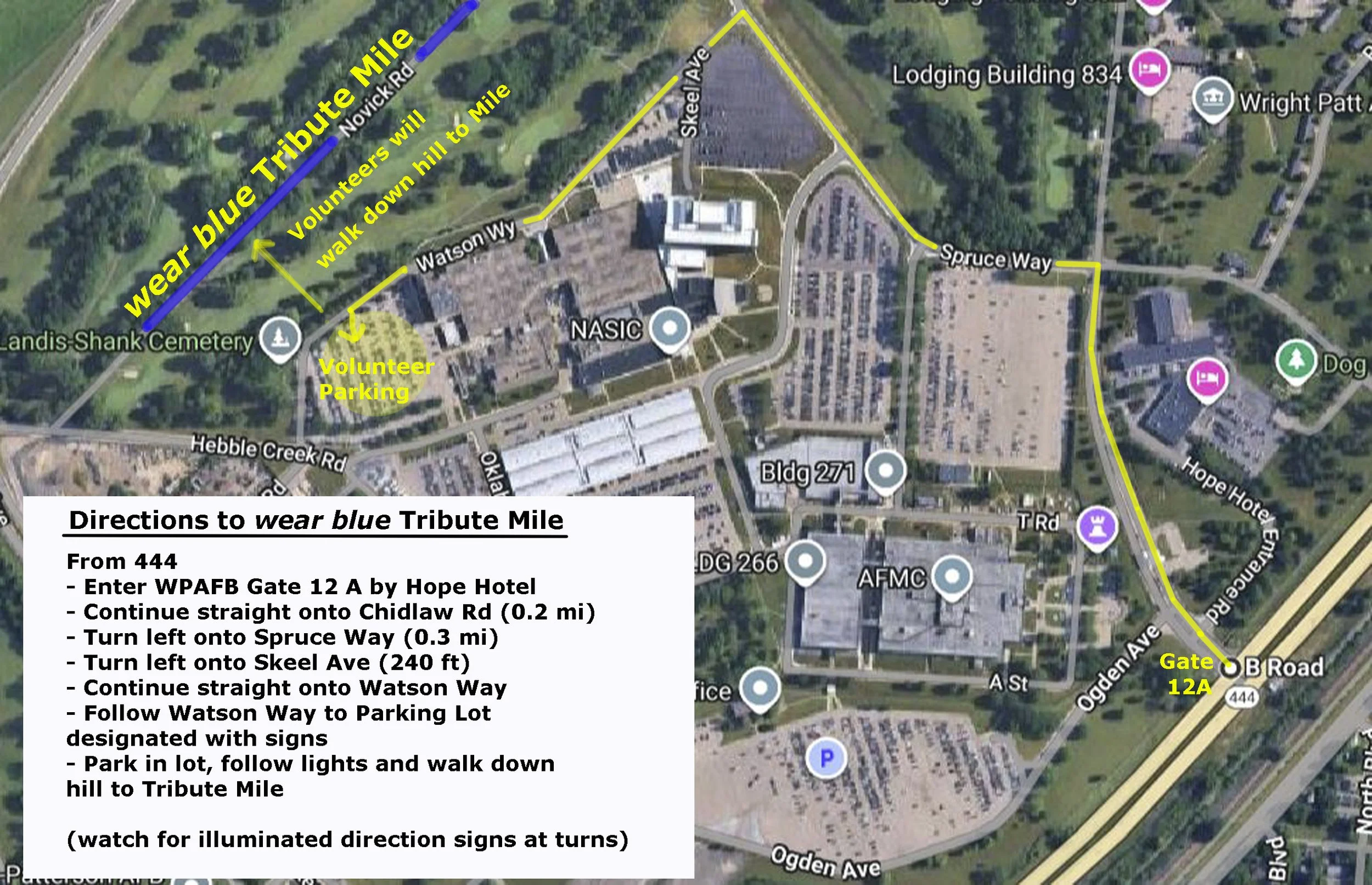 Enter Wright-Patterson AFB at Gate 12-A, 4412 Chidlaw Road, Wright-Patterson AFB, Ohio.